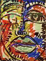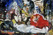These paintings show hectic brushwork and strong colours, and the use of papier-mâché and other materials to create a relief like effect. His last work shows a development towards more subdued colours and a spatial three-dimension effect…”.