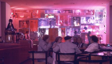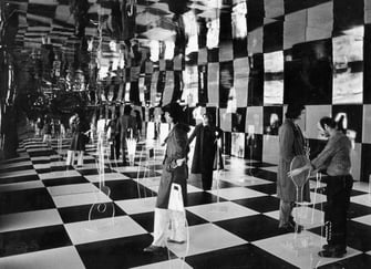 ‘Taller’ found more exciting opportunities to extend the limits of each experiment, enabling it to work out new relationships between art and technology – a problem which must be face by contemporary man. In May 1968 the group was invited by Notthingham’s Midland Group Gallery to represent Uruguay in a festival of Latin American Arts. The workshop’s most important work to date is a large kinetic mural in a London restaurant (38 High Street Kensington). The basic idea was conceived collectively – the main aim being the resolution of the problem posed by the individual spaces into which the structure is divided. Within these spaces geometric shapes move at different speeds. Coloured lights multiply the images of these moving shapes reflected in the various mirrors which form the outlines of each space. The integration of actual movement into the work creates a relationship of space and time producing a new type of dialogue for the spectator.