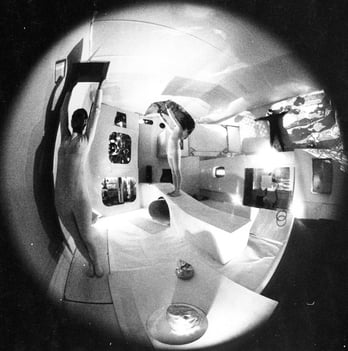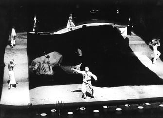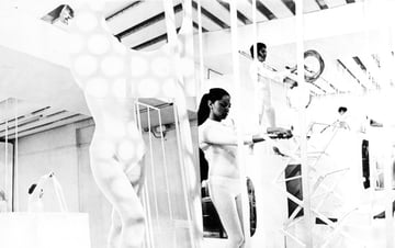 The environment is exceptionally carefully worked out. At its base there probably is a Corbusier module, or at least a golden section. No distance or linear dimension appears accidental. Flexible laths bent into a surrounding square by a supine performer take on a familiar arc. Other hollow squares and cubes jar and jiggle the eye in picket-fence moire patterns.