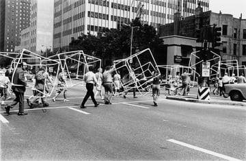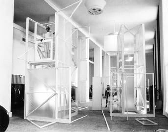 Its purpose was to involve passersby in sculpture and to test their reaction as they had to weave through, round, and in and out of the cube forest.